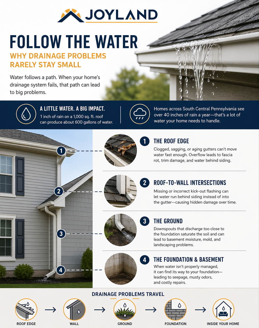 We see this all over older homes in places in the Midstate where exterior systems may have been patched, repaired, or left to age for decades. From the street, the house may look perfectly fine. Up close, the drainage story is often a lot messier.