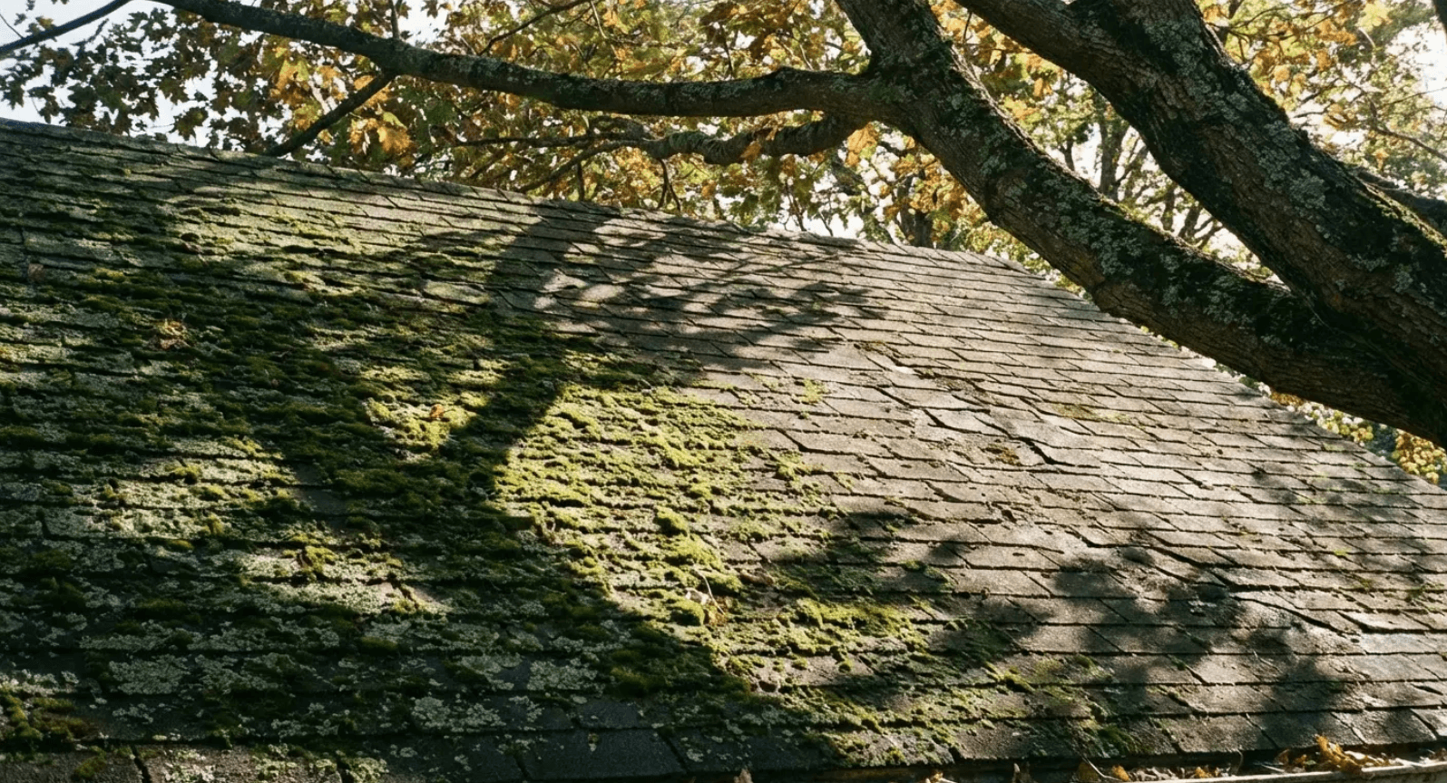 This process doesn't require heavy moss coverage. Even thin patches that look more like discoloration than growth can hold enough water to cause problems.