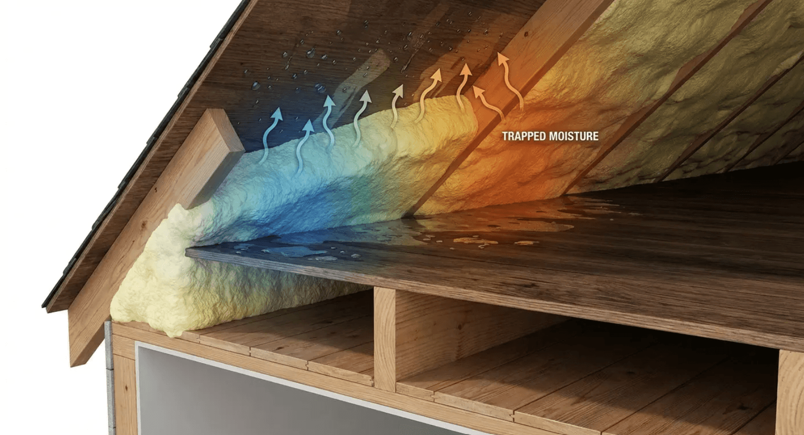 Cathedral ceiling assemblies eliminate the attic space that traditionally buffered temperature and moisture differences. The roof deck becomes the ceiling deck, creating vulnerability to condensation-related failure that standard construction doesn't experience.