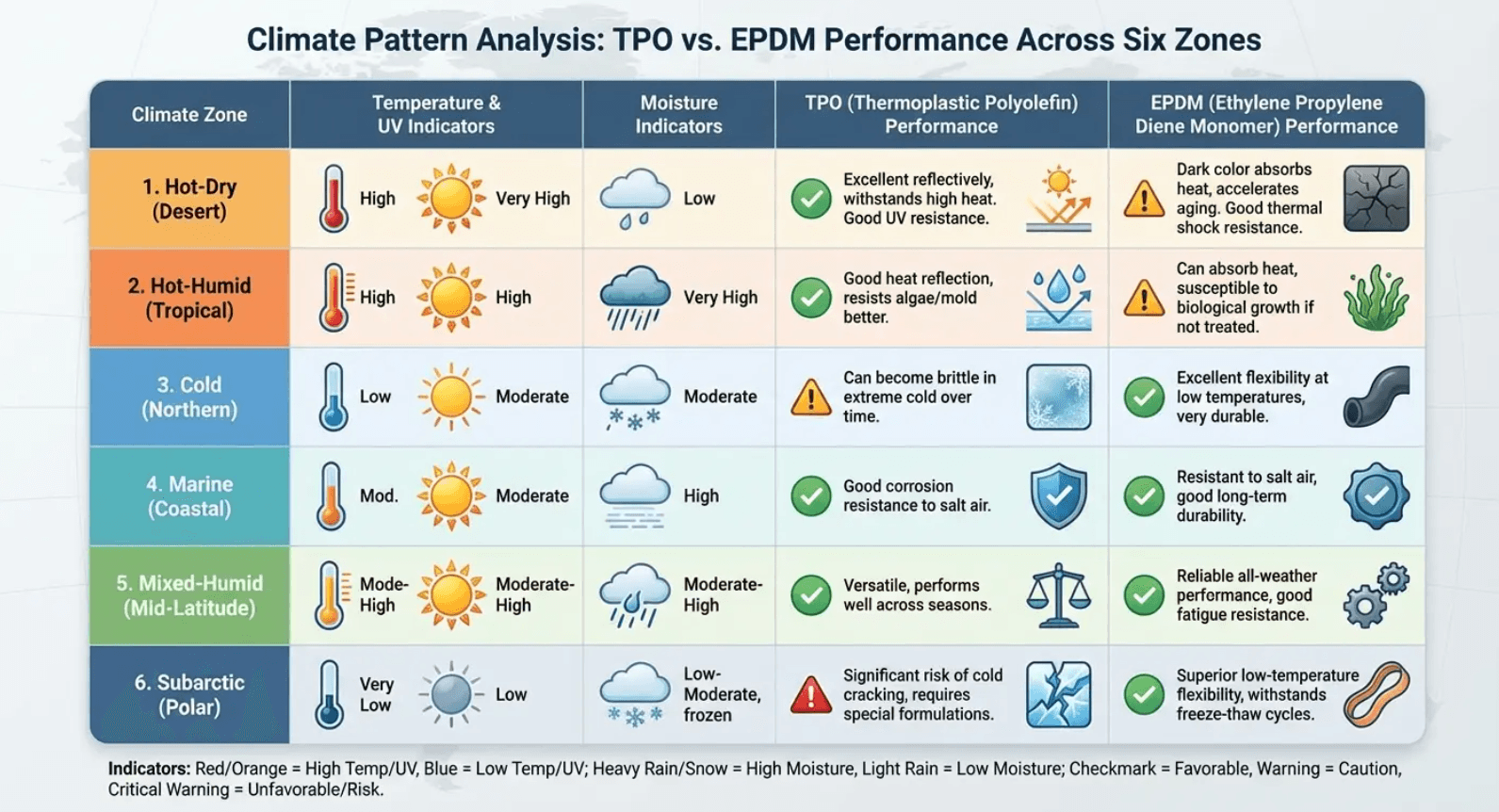 | Climate Pattern | TPO Performance Considerations | EPDM Performance Considerations |